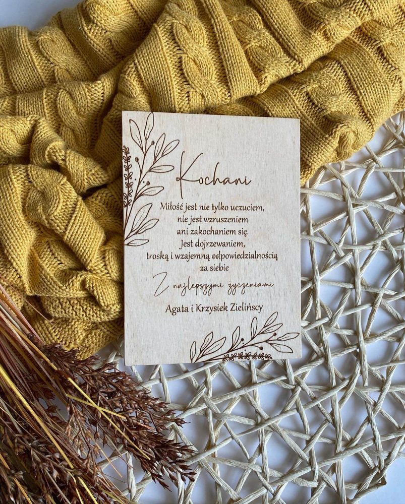 - Koperta w wybranym kolorze w formacie B6 z dodatkiem jutowego sznurka oraz drewnianego grawerowanego krążka
