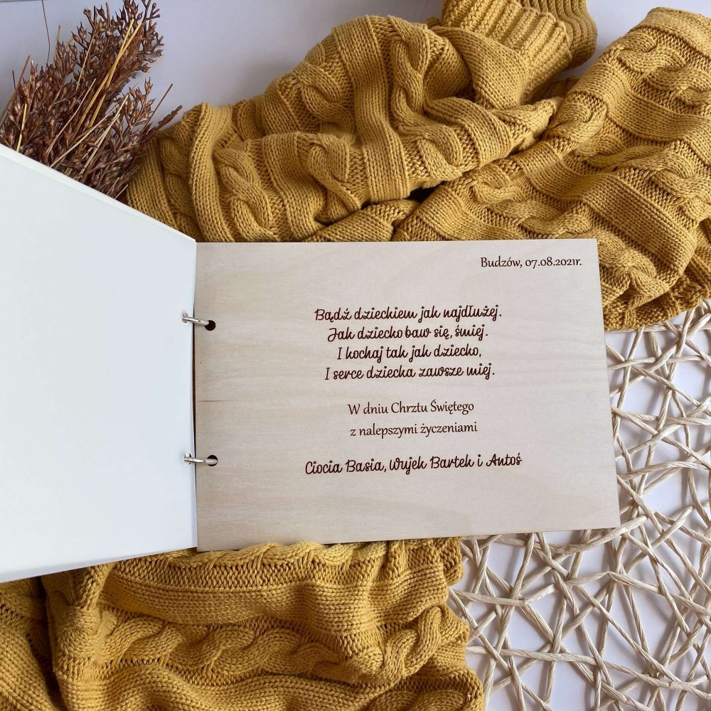 Drewniany album na metalowych kołach to wspaniała pamiątka na prezent dla dziecka z okazji chrztu, pierwszych urodzin lub innej ważnej okazji. Personalizowana dedykacja wewnątrz sprawi, że nabierze on wyjątkowego oraz niepowtarzalnego klimatu.