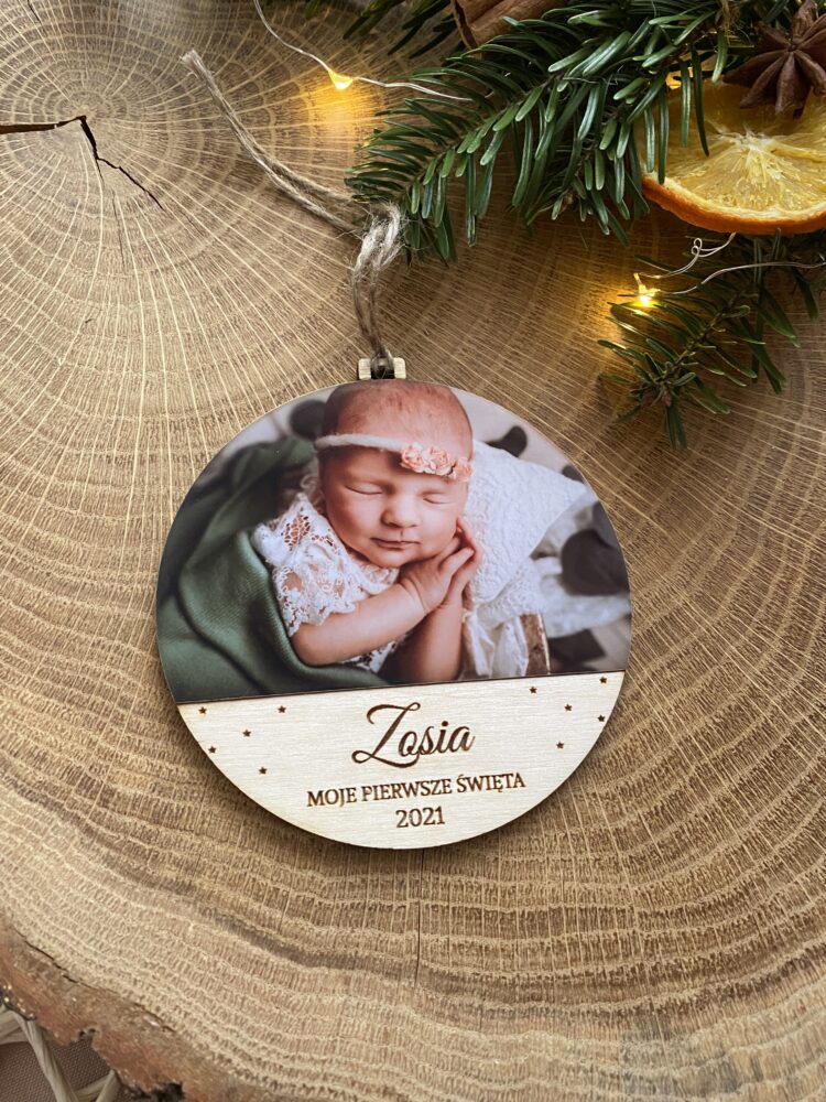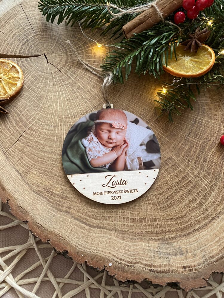 Drewniana bombka ze zdjęciem oraz imieniem