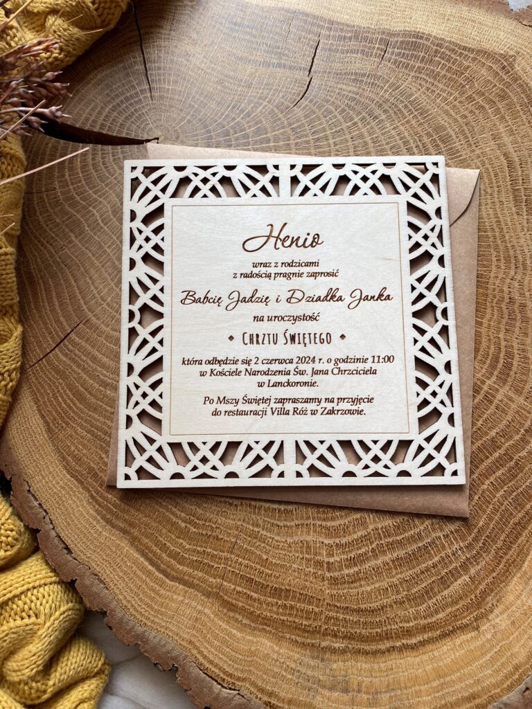 Drewniane zaproszenie z okazji Chrztu z grawerowaną treścią zachwyci gości oryginalną formą. Zaproszenie dwustronnie grawerowane.