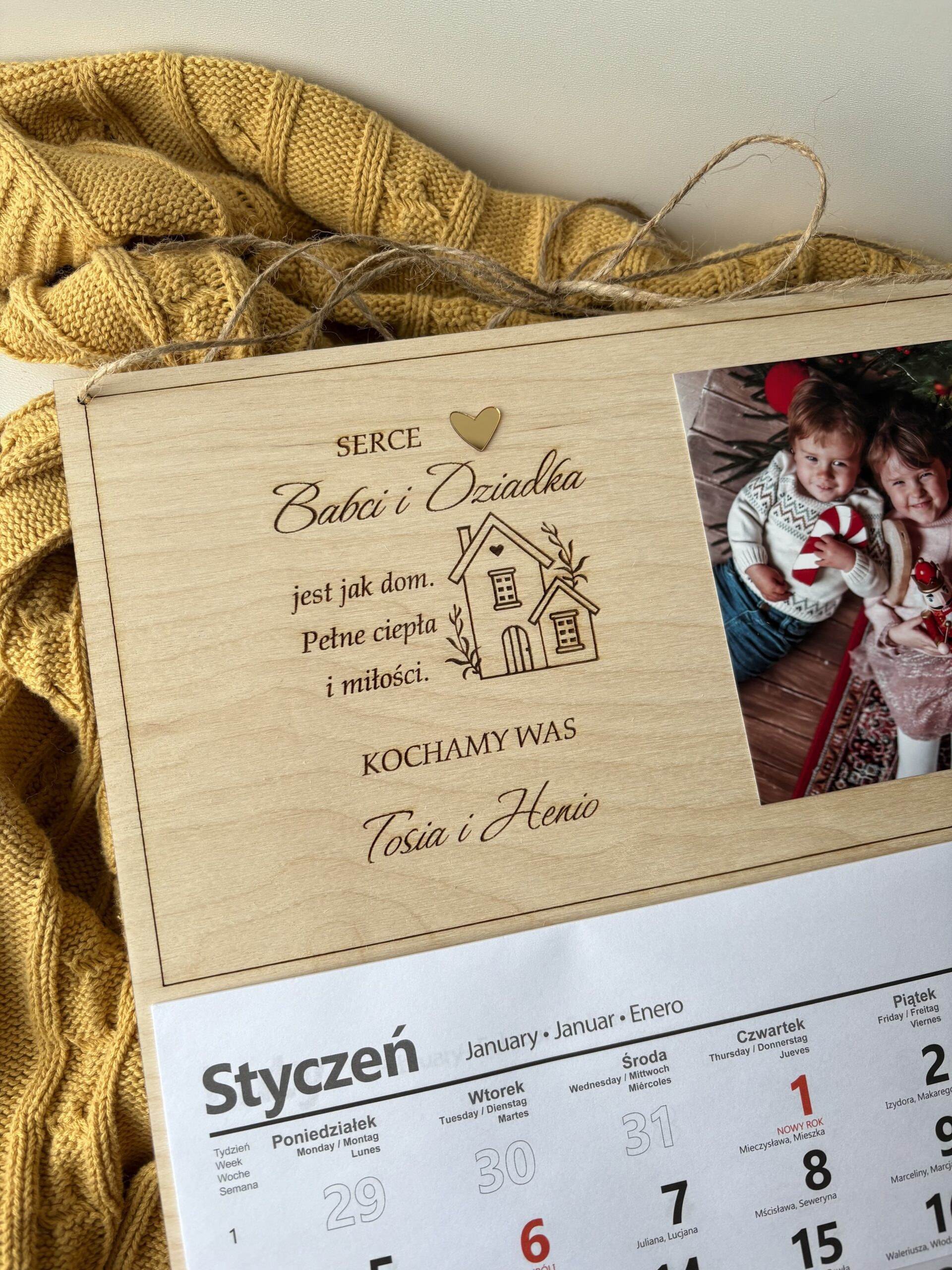 Drewniany Kalendarz z pamiątkową personalizacją oraz zdjęciem, jako piękny i emocjonalny prezent dla dziadków.