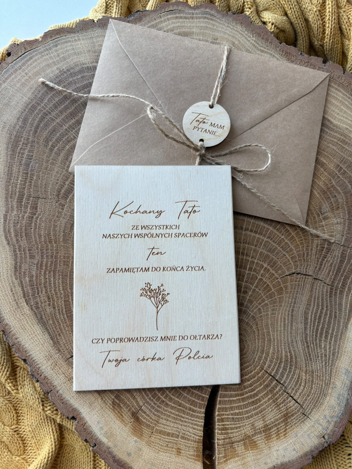- Koperta w wybranym kolorze w formacie B6 z dodatkiem jutowego sznurka oraz drewnianego grawerowanego krążka