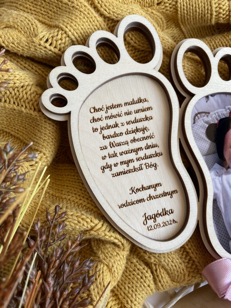 Podziękowanie dla rodziców chrzestnych w postaci drewnianych stópek ze zdjęciem.