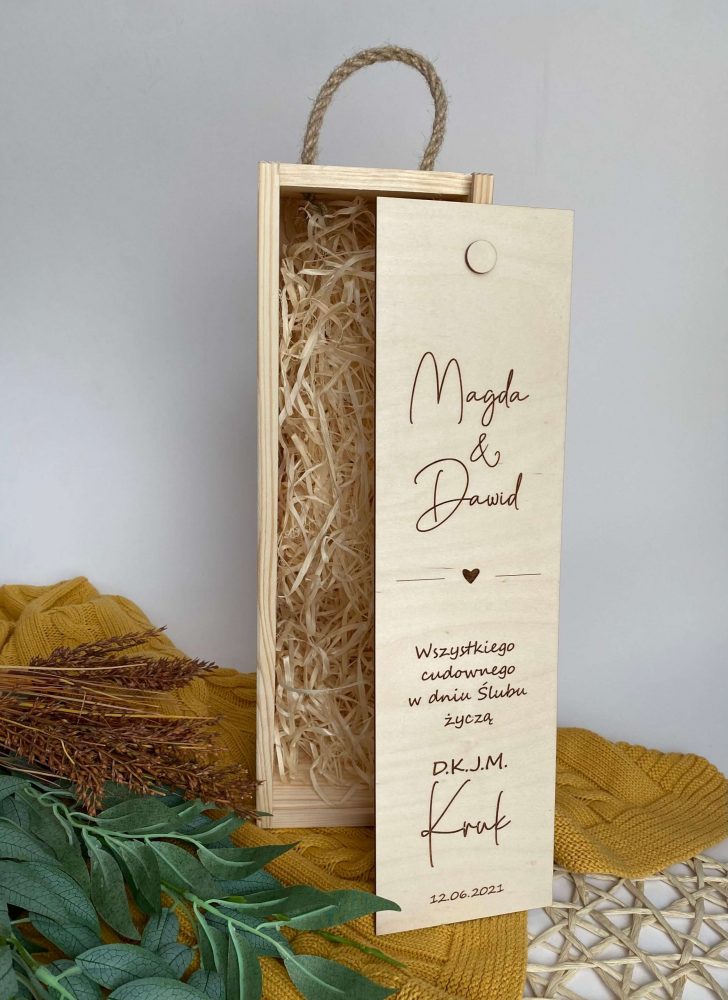 Personalizowana skrzynka na wino jako nietuzinkowy dodatek do prezentu ślubnego.