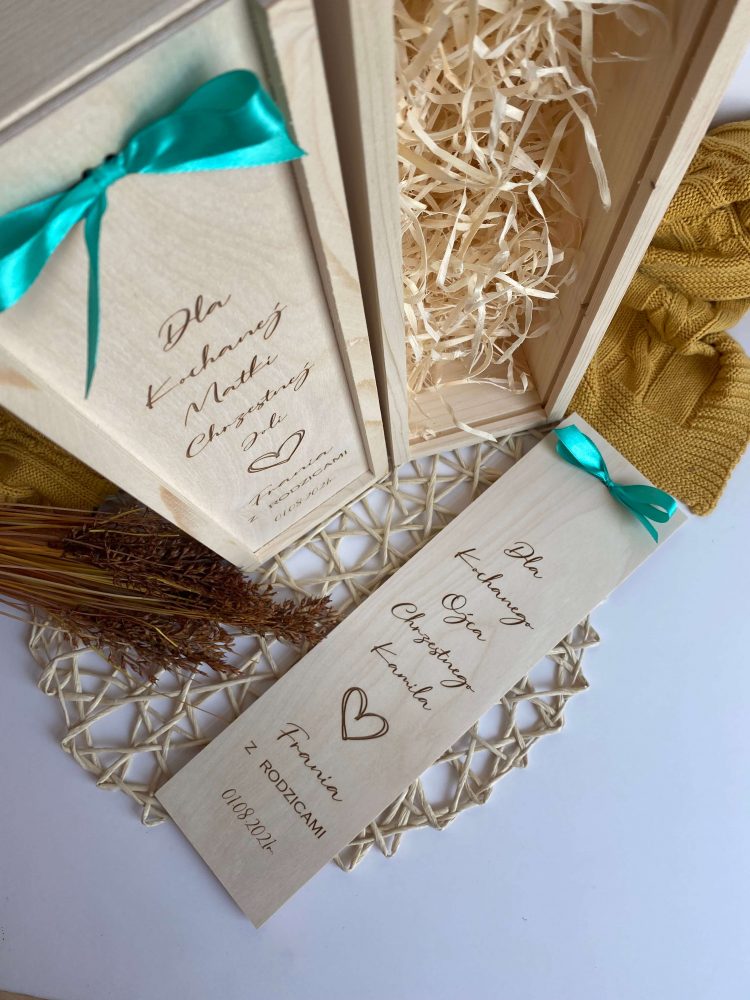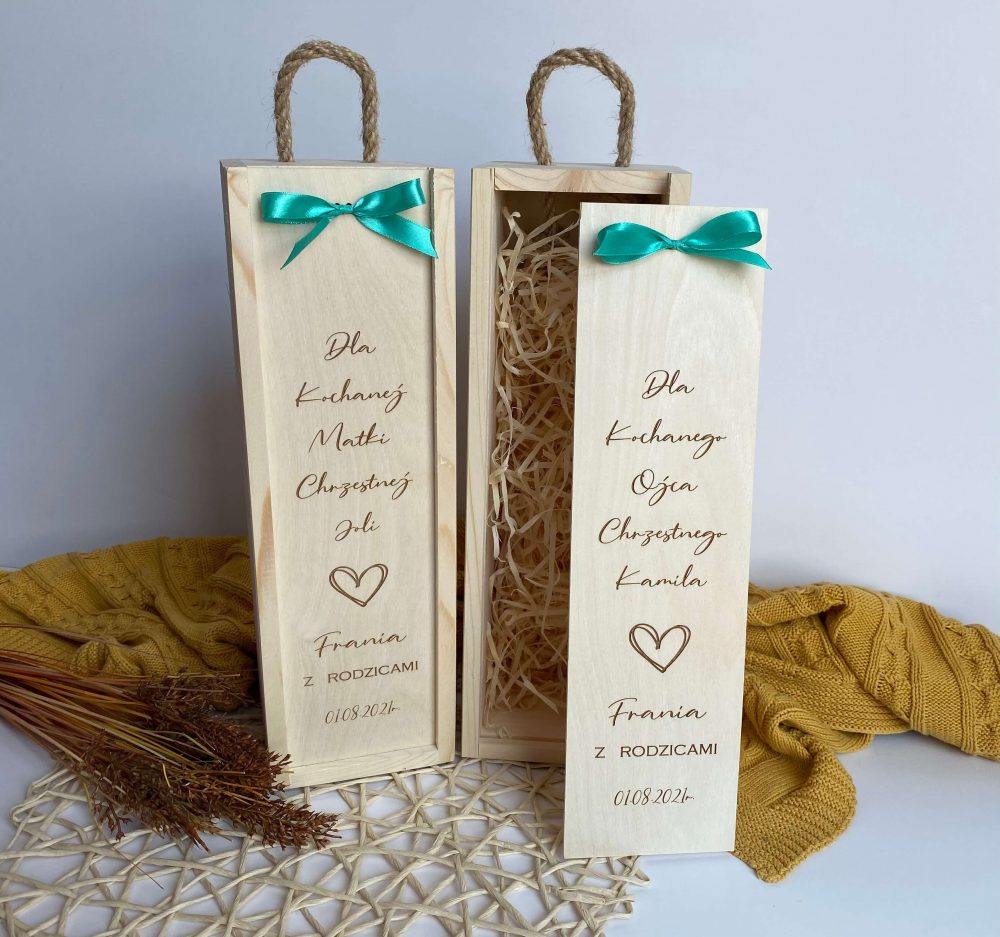 Drewniane grawerowane skrzyneczki na wino jako forma podziękowania dla rodziców chrzestnych.