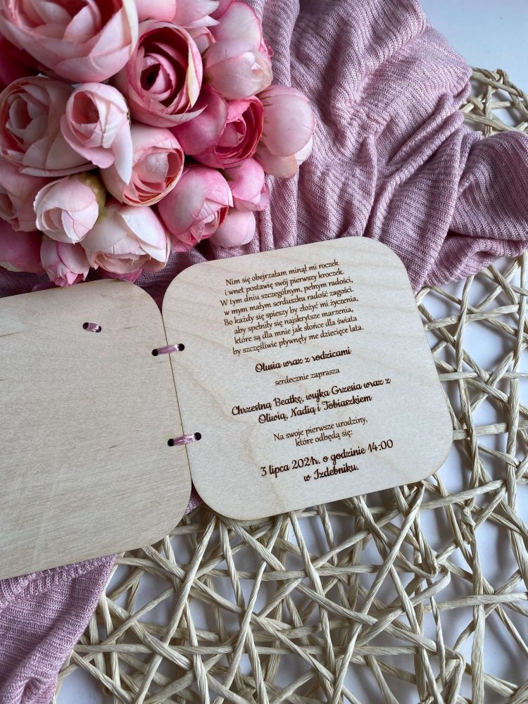 Drewniane zaproszenie na urodziny z grawerowaną treścią zachwyci gości oryginalną formą.